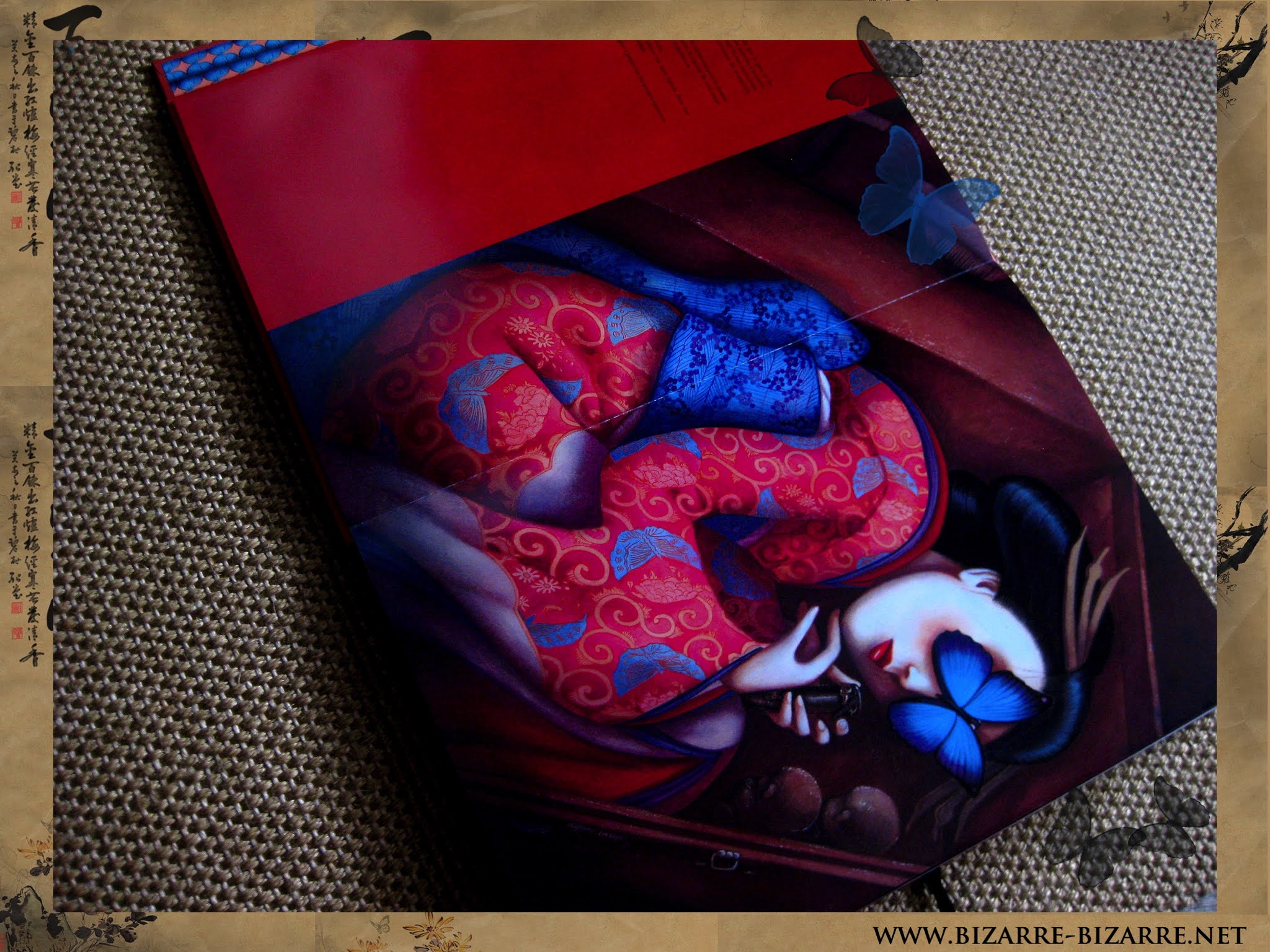 Mme Butterfly est une histoire qui semble centrale dans l'oeuvre de Benjamin. Il lui avait déjà consacré une place dans le pop-up "Il était une fois", et "Les amants papillons" évoquait un univers similaire. Ce qui m'a le plus marqué après la première lecture, c'est ce contraste que Benjamin a su instaurer entre le début et la fin de l'histoire. Les premières illustrations sont très lumineuses, aux couleurs chaudes et chaleureuses. Moi qui ne connaissais pas l'histoire, je devinais une belle histoire d'amour. Je trouve notamment magnifique l'image où l'on découvre pour la première fois Madame Butterfly, au milieu d'un jardin japonais fleuri et apaisant.